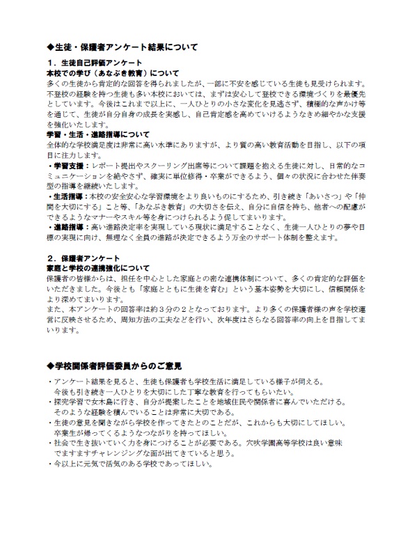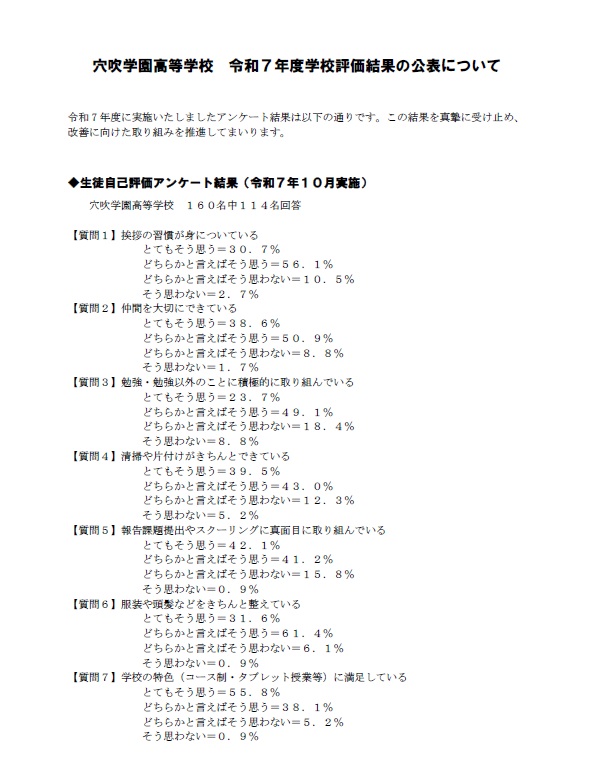 2025/12/25 オープンキャンパス 学校関係者評価委員会を行いました 12月10日、令和7年度学校関係者評価員会を行いました。 教育関係者や地域関係者の方にお越しいただき、本校の学校運営についてご意見を伺いました。 学校評価➀ダウンロード 学校評価②ダウンロード 学校評価③ダウンロード いただいたご意見をもとに、今後もより良い学校運営を推進してまいります。 お越しいただいた学校関係者評価委員の皆様、ありがとうございました。