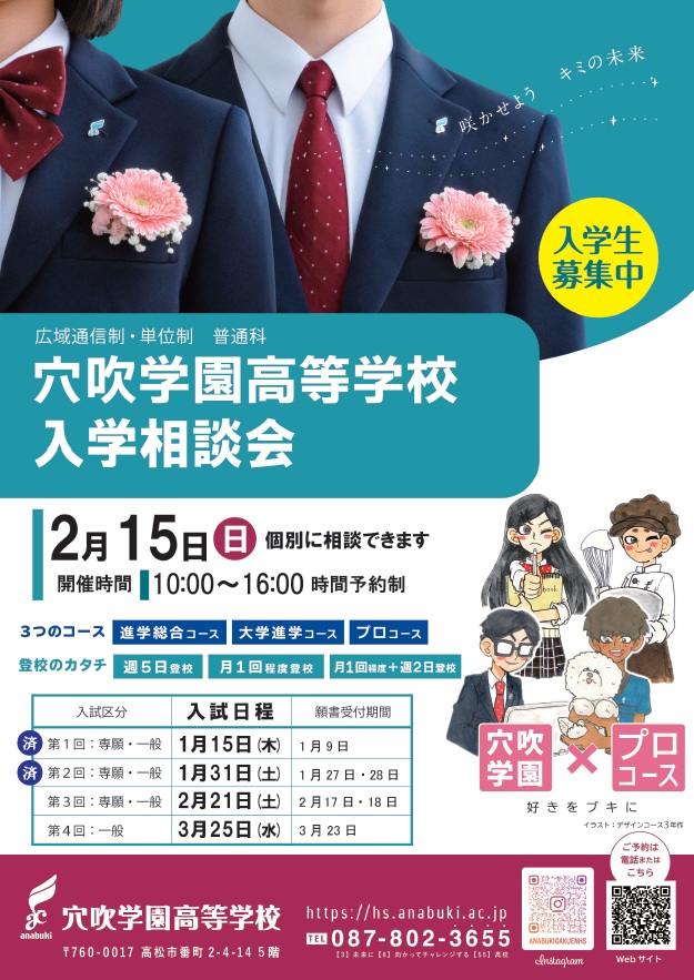 穴吹学園高等学校では、2月15日(日)、入学相談会を行います。